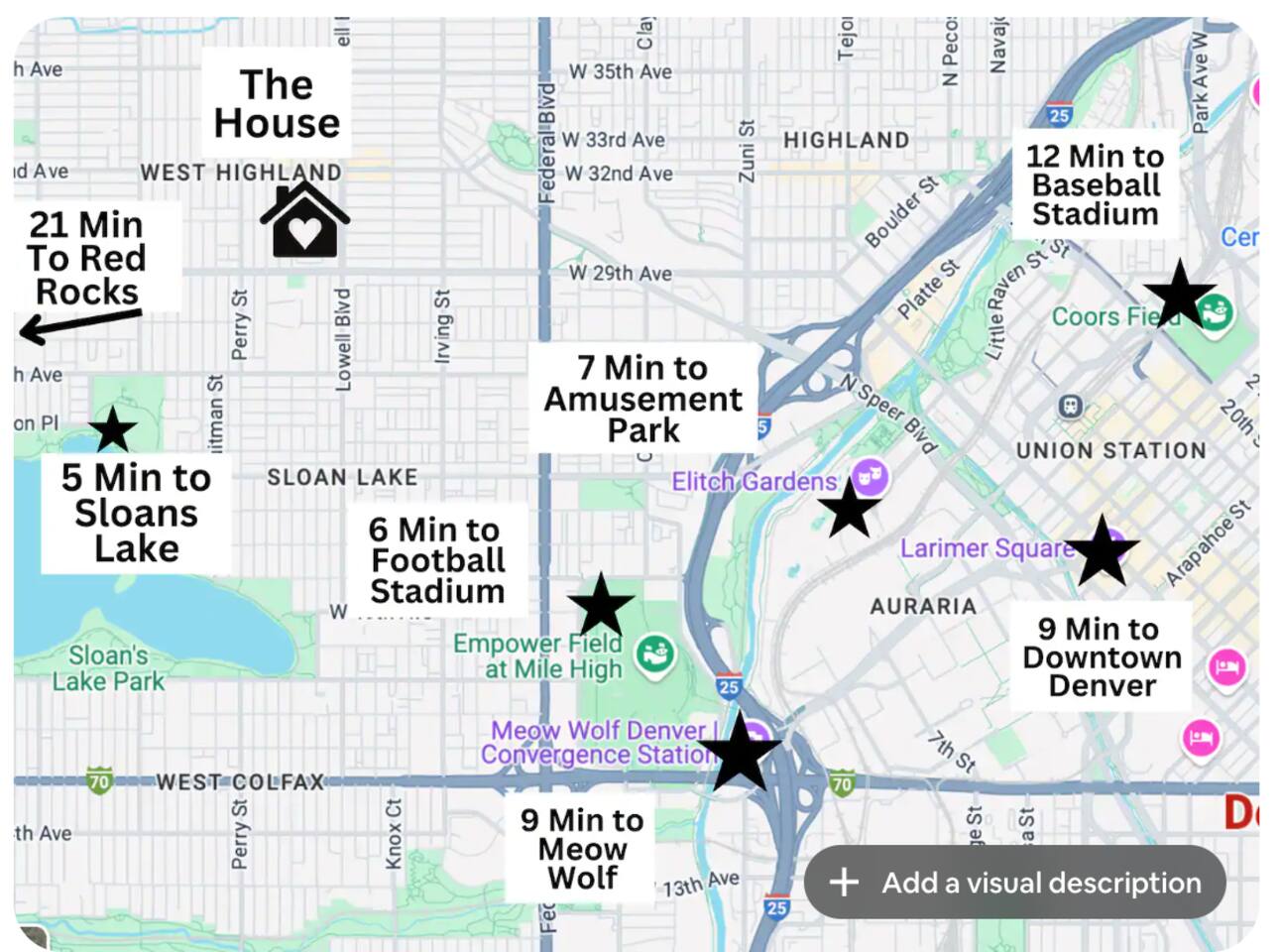 The West Highland neighborhood is one of the most coveted neighborhoods to live in in Denver. Cute Victorian homes and bungalows grace the streets. 3 awesome business districts are within walking distance. 32nd and Lowell is literally just steps from our front door. Full of great restaurants, bars and bakeries you can find just about everything you need. The best restaurant is Il Camino - fresh Mexican and is literally around the block from our house. Mead Street is a great dive bar, Happy Bakeshop has award winning cupcakes, and the Denver Bread Company does unbelievable bread (and they offer free samples!). If you're looking for great Italian check out Spatolla and if you want Indian go to Himichulli. The massages at LoDo massage are awesome and Highlands Pilates has a great workout. LoHi - with it's trendy bars and fine food is about a 5 minute drive (20 minute walk) towards the city center. Root Down, Linger and Postino are awesome places. Williams and Graham is a great speakeasy. If you walk for another 10 minutes you will be in LoDo. On the other side of West Highland, about a 30 minute walk, Tennyson and 42nd has a lot more amazing restaurants and breweries. The grocery store, King Soopers, is about a 5 minute drive (30 minute walk) to Federal. Copper Mountain ski resort is a one hour, twenty minute drive (no traffic)! Vail is just 25 minutes further.